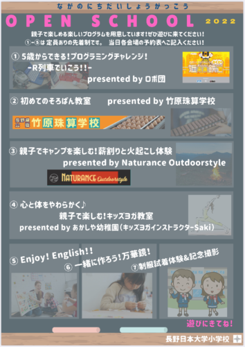 5月14日(土)に開催予定の長野日本大学小学校 オープンスクールの体験ブースと当日のタイムテーブルを公開いたします!