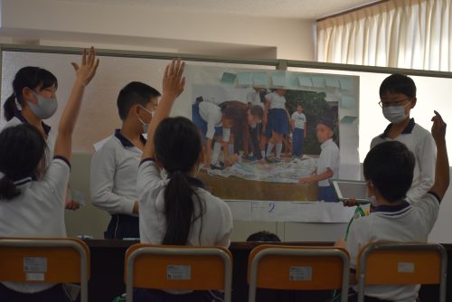 4~6年生が準備した各教室が写真展のブースとなっており、1〜3年生の児童が各教室を回って、写真を見ながらお話を聞きます。高学年の児童たちは、写真にまつわるエピソードを低学年の児童にも分かるように、なるべくわかりやすい言葉で伝えます。身振り手振りも交えながら、一生懸命伝えていました。スライドを使用した一方的なプレゼンテーションとは少し異なり、双方向の形式では本当の意味での「伝える力」が試されます。