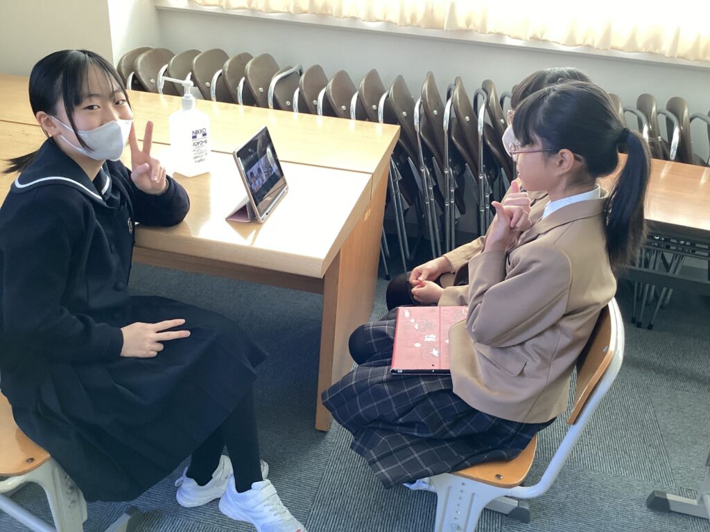 お互いに緊張もあったせいか、最初はたどたどしいやり取りのグループが多かったものの、少しずつ相手の英語での質問が分かってくると、”Excuse me?” “I like dogs, too!” “What’s your favorite anime?” など、授業で習った英語を使いながらメッセージのやり取りを楽しんでいました。