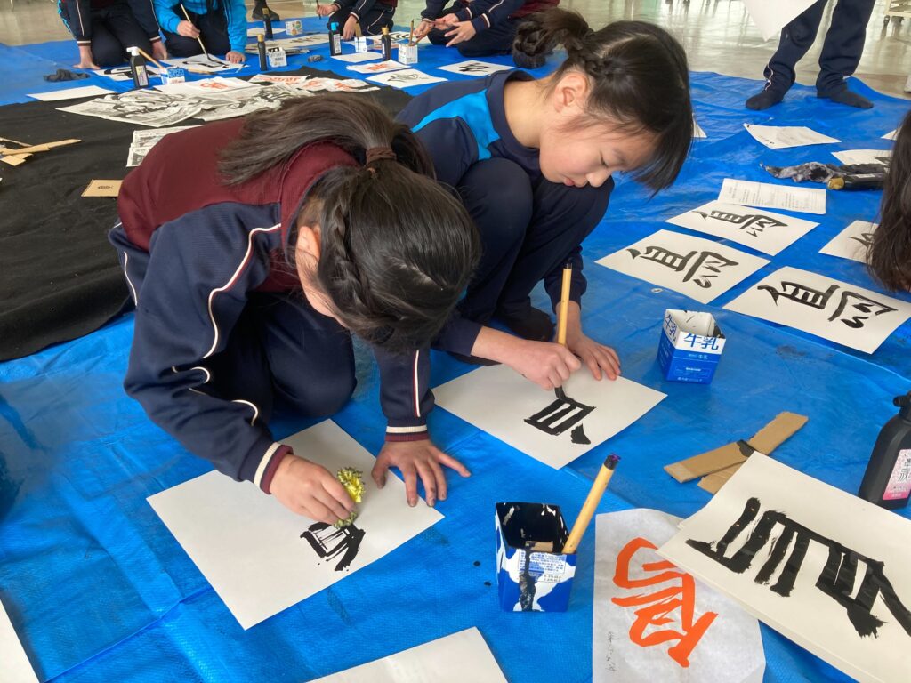 また、5年生の授業では「鳥をテーマに漢字をアートで表してみよう!」という授業目標を設定し、書道をより「芸術」の観点から捉えた今までの書写とは全く異なる授業を展開していただきました。大教室の床にブルーシートを敷き、先生のお手本を元にしながら子どもたちは自由に「鳥」を表現していきます。「自分の感覚のままに、どんな表現方法でもいいんだよ」という先生のご指示のもと、中には筆の代わりにスポンジや段ボール、自分の手を使って書いている児童も。これまでにない書道による表現を楽しみながら、何度も何度もオリジナルの「鳥」を創り出そうと真剣に取り組む子どもたちの姿がとても印象的でした。参加した児童にとっても、授業サポートで参加した本校教員にとっても、新たな書の魅力に触れるとても貴重な機会となりました!