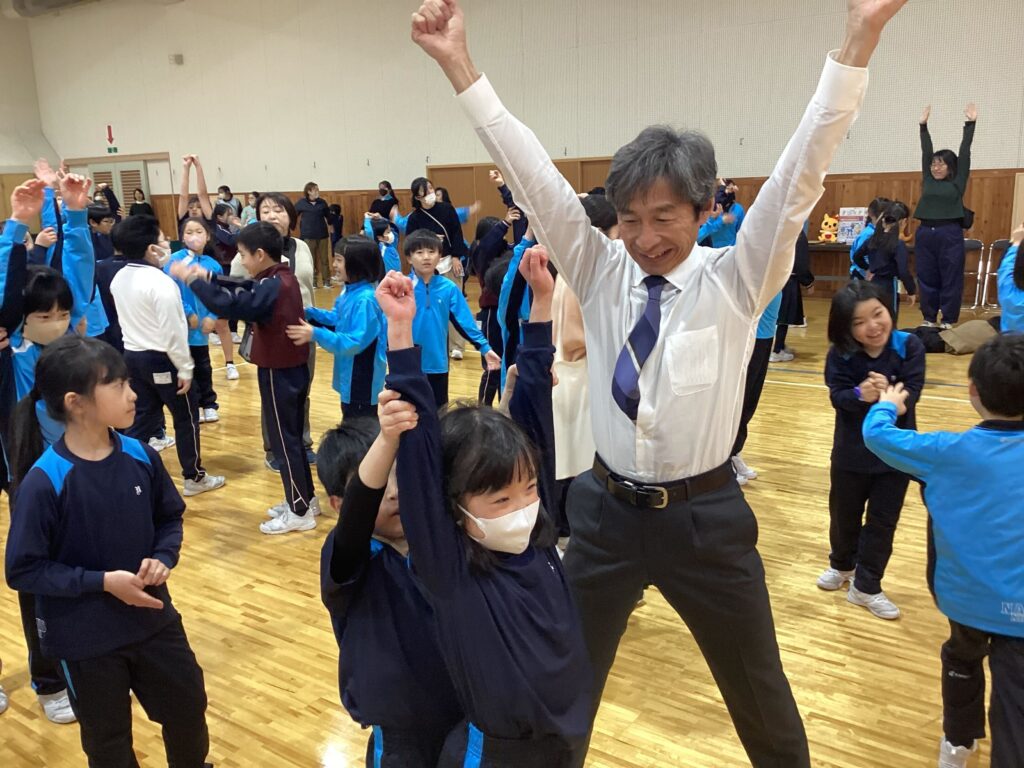 全員での記念撮影を終えると、出口では荻原市長、鈴木先生、大石先生、そしてルカリオと一人一人ハイタッチ!ラジオ体操を通してたくさんの笑顔が生まれた、とても素敵な時間となりました。