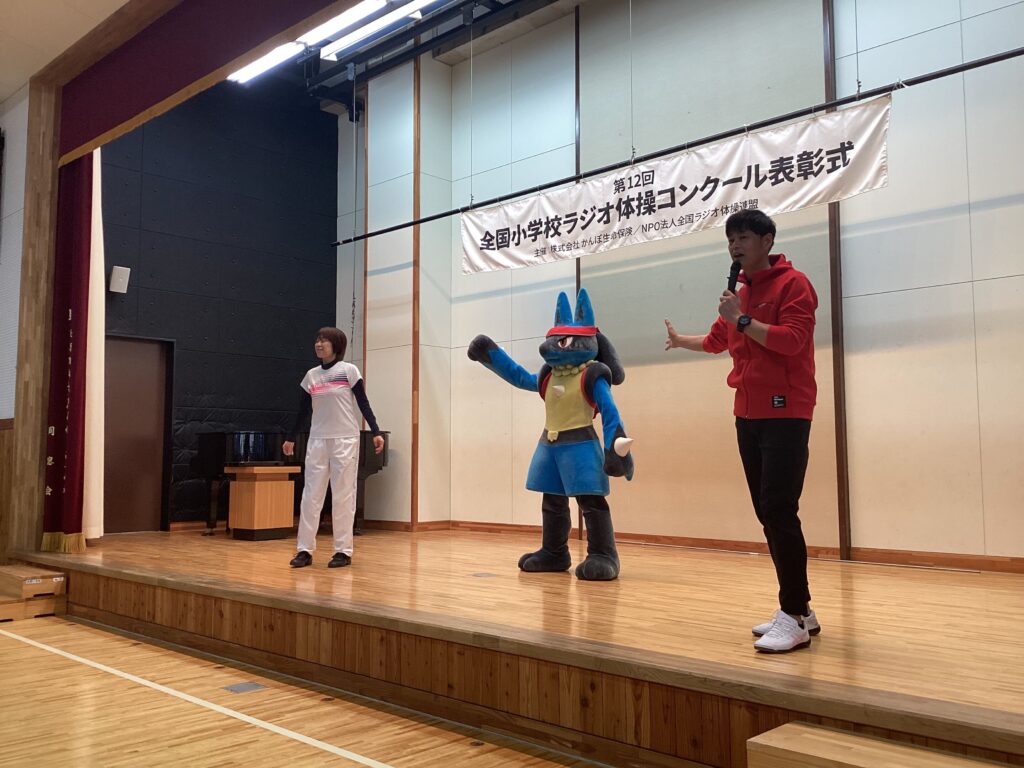 表彰式を終えて始まったラジオ体操授業で登壇したのは、ラジオ体操指導者でテレビにも出演されている鈴木大輔先生、アシスタントの大石美雪先生、そしてラジオ体操ポケモンとして活躍中のルカリオです。大好きなポケモンを目の前に、子どもたちは大興奮!楽しく体を動かす運動&ラジオ体操を荻原市長と一緒に思いっきり楽しむことができました。
