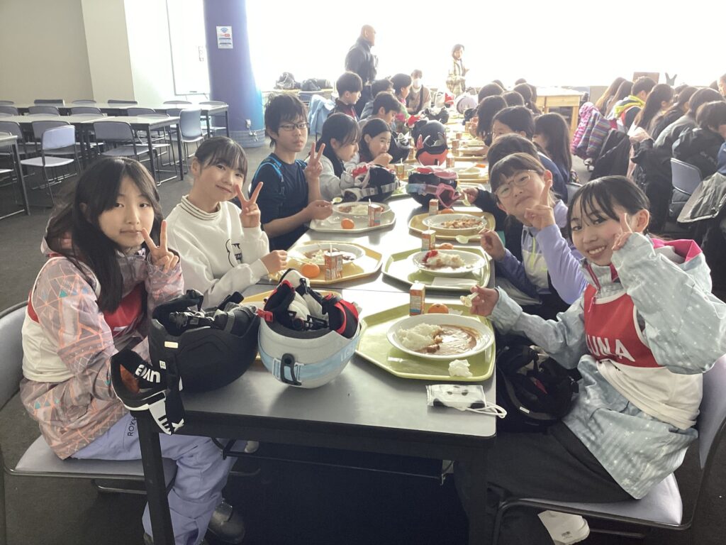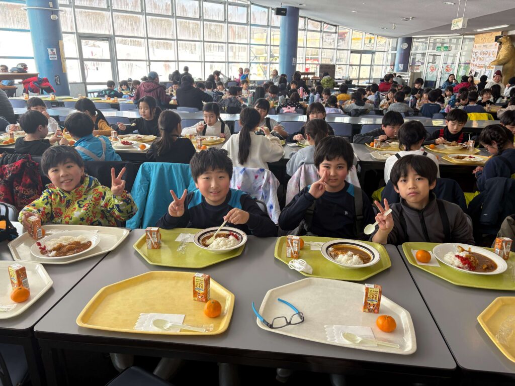 午前の活動が終わると、みんな食堂に集合してカレーライスをいただきます。たくさん滑った後のおいしいカレーにみな大満足の様子。昼食後の休憩時間も終わりに近づくと、子どもたちから「先生、まだ~!?」の声が…。さすが子どもたち、元気いっぱいです。