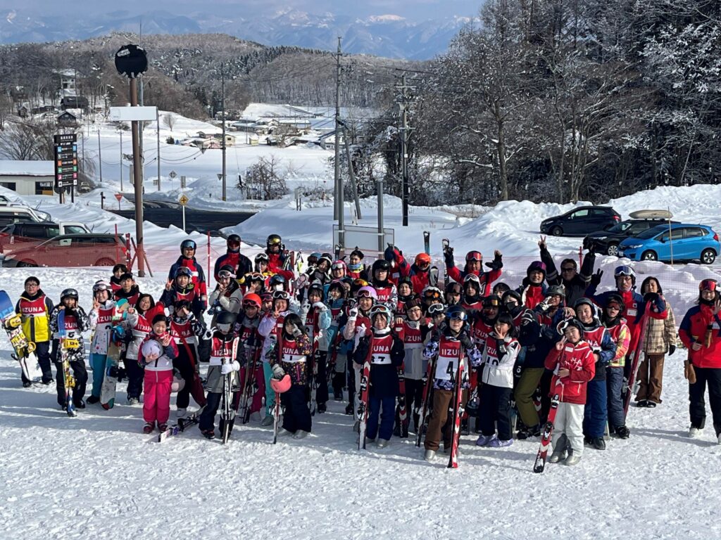 毎年お世話異なっているいいづなスキーリゾートに到着して準備を済ませ、開講式を終えるといよいよレッスン開始です。すぐにリフトに乗り込むグループ、まずは乗り場付近で短い距離を滑ってみるグループなど、レベルに合わせて分けたグループごとにつくインストラクターの方の指示に従いながら、スキーやスノーボードを楽しみます。最初は緊張気味だった子どもたちも、時間が経つにつれてすぐに慣れていき、カメラを向けるとピースサインで応じてくれるようになりました。
