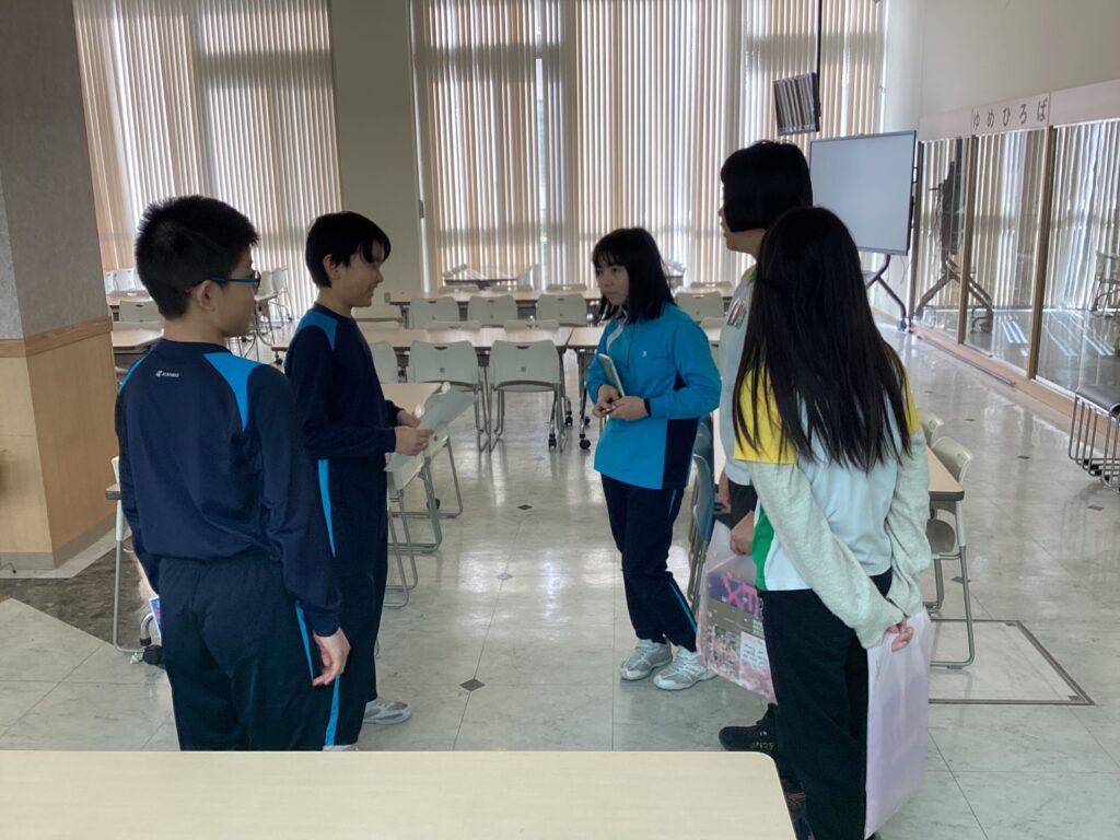 そしてその後はいよいよ小学校案内です。事前に準備した紹介文を使いながら、来校した皆さんに長野日大のことを知ってもらおうと、それぞれが前向きに挑戦しました。「これ、何ていうんだっけ?」「この前習った表現、使えるんじゃない?」などと声を掛け合いながら、自分の思いを伝えるためのリアルな英語コミュニケーションを実践していました。