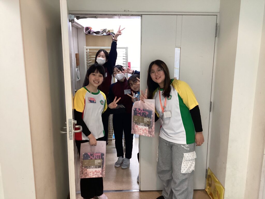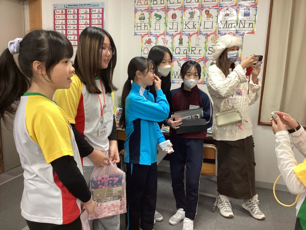 そしてその後はいよいよ小学校案内です。事前に準備した紹介文を使いながら、来校した皆さんに長野日大のことを知ってもらおうと、それぞれが前向きに挑戦しました。「これ、何ていうんだっけ?」「この前習った表現、使えるんじゃない?」などと声を掛け合いながら、自分の思いを伝えるためのリアルな英語コミュニケーションを実践していました。