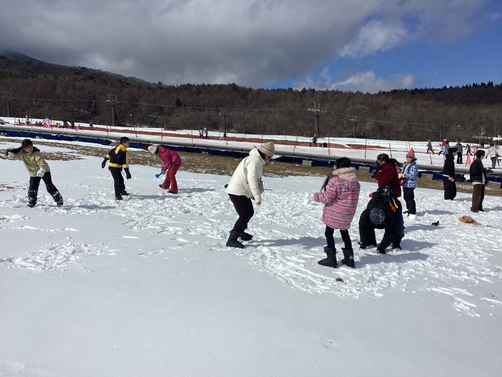 午後は、スキー教室でもお世話になっているいいづなスキーリゾートへ向かいました。台湾は沖縄本島とほぼ同じ緯度に位置しており、高地を除いて雪が降ることはほとんどありません。中には生まれて初めて雪を見たという児童もいたようで、雪の上を走り回ったり、何枚も写真を撮ったりと大興奮の様子でした。短い時間ではありましたが、そり遊びや雪合戦など、大自然の中で両校の子どもたちが夢中になって楽しそうに遊ぶ姿があちこちで見られました。