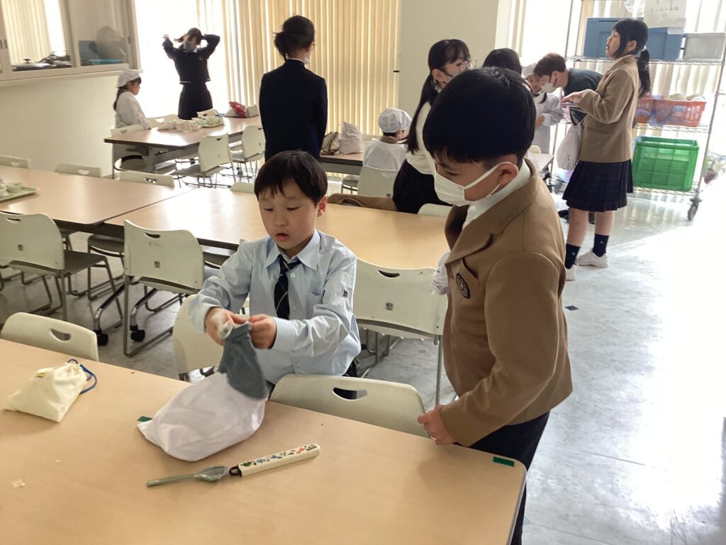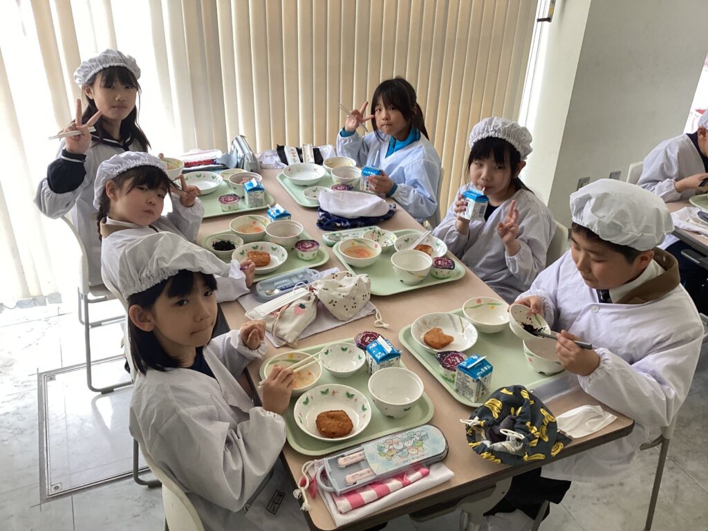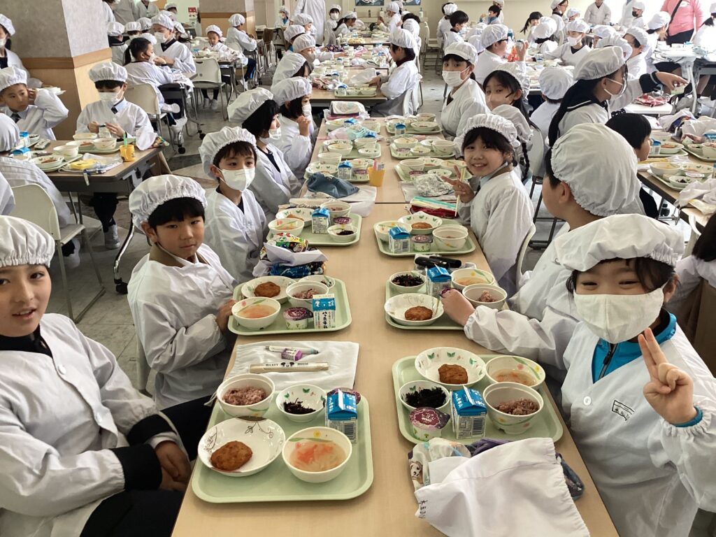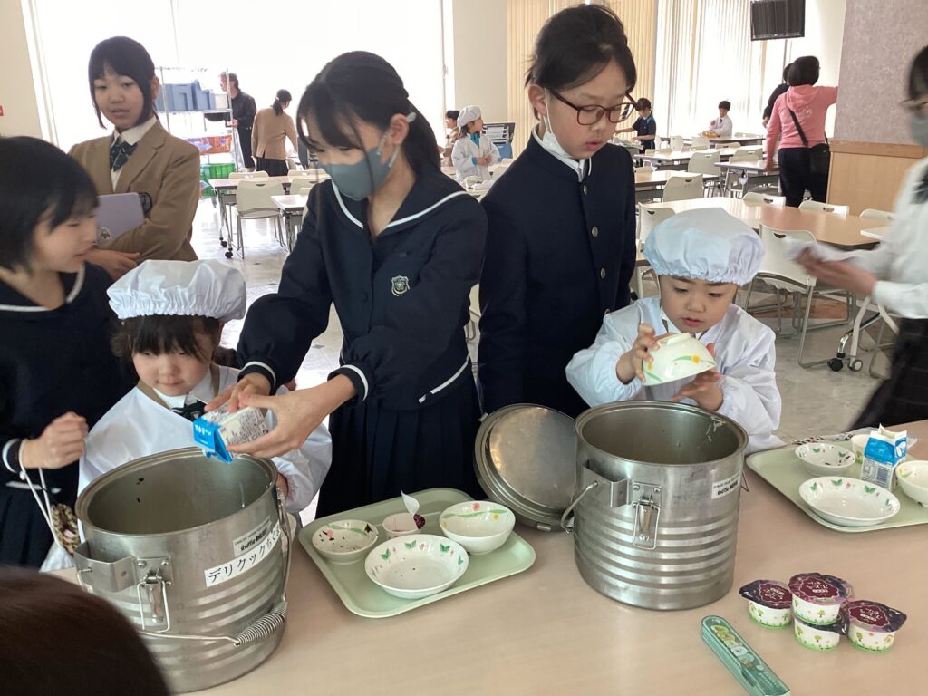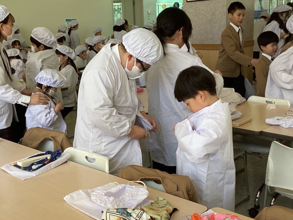 初めての給食でも、給食着の着方から配膳方法、片付け時の注意まで、しっかりと伝えてくれていました。代わりに自分がやってしまうのではなく、1年生ができるまでとても良い距離感を保ちながら見守ってくれる6年生、さすがです。