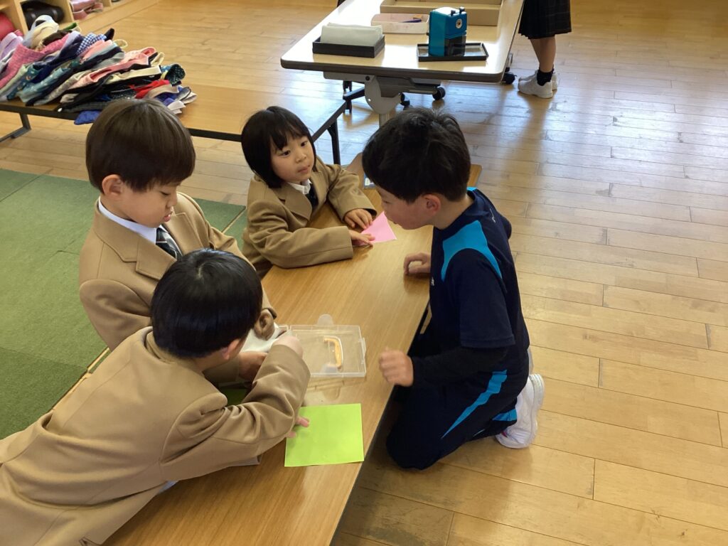 入学したばかりの1年生に対しても、同じホームのお兄さん、お姉さんが学校生活について教えてくれます。まずは顔合わせから。まだ緊張の抜けない1年生に、ペアとなった6年生が優しく声掛けをしてくれました。
