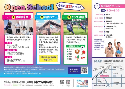 9:00~9:30 受付9:30~10:00 本校生徒による学校紹介10:10~11:40 体験授業(探究・家庭科×英語・社会)・保護者説明会・授業参観11:50~12:30 施設見学・個別相談など(制服の試着体験ができます)12:30 解散
